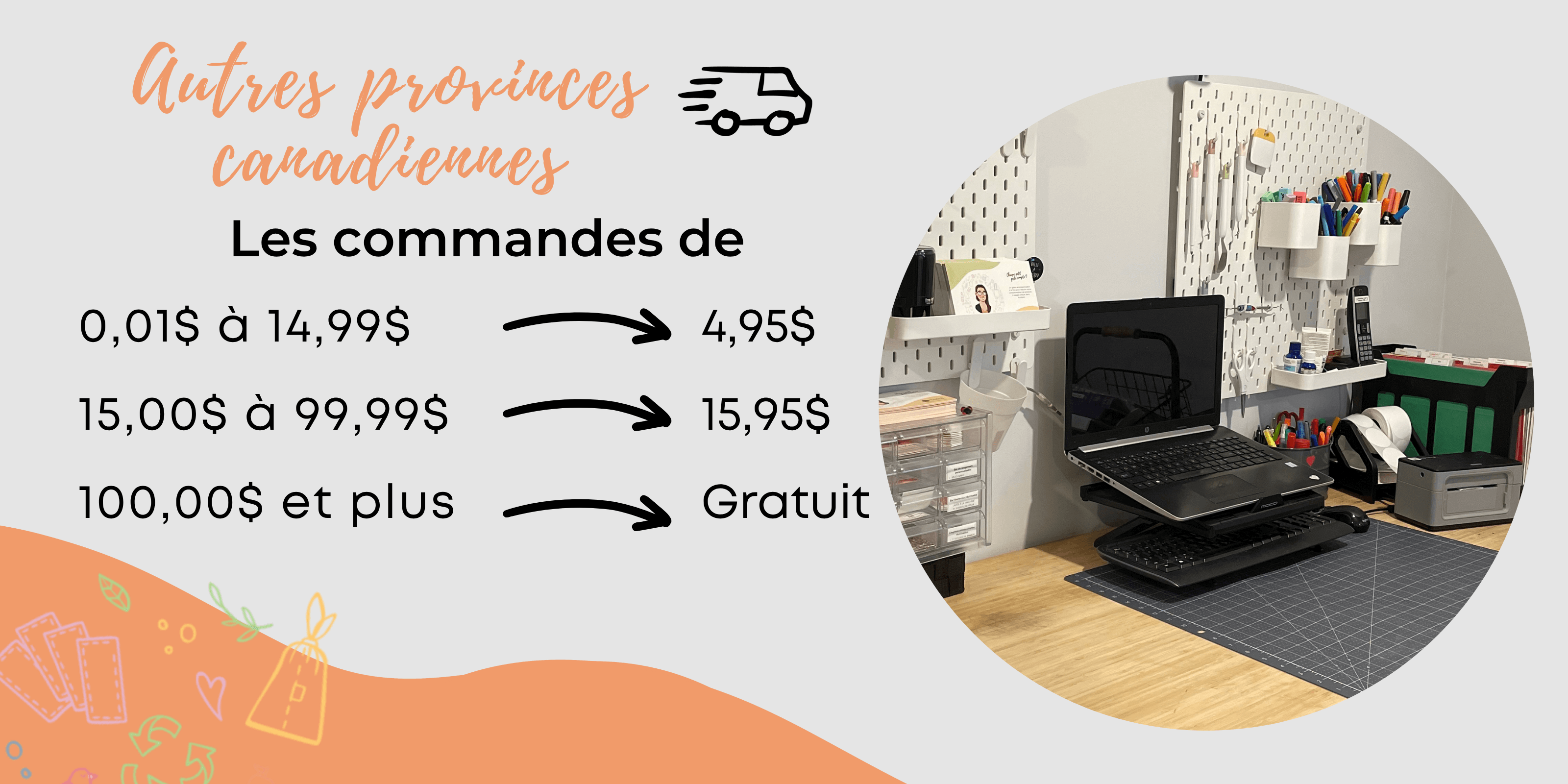Les commandes en bas de 15,00$ sont généralement envoyées par Postes Canada, via le courrier standard. Il n'y a pas de signature ni de numéro de suivi avec Postes Canada.